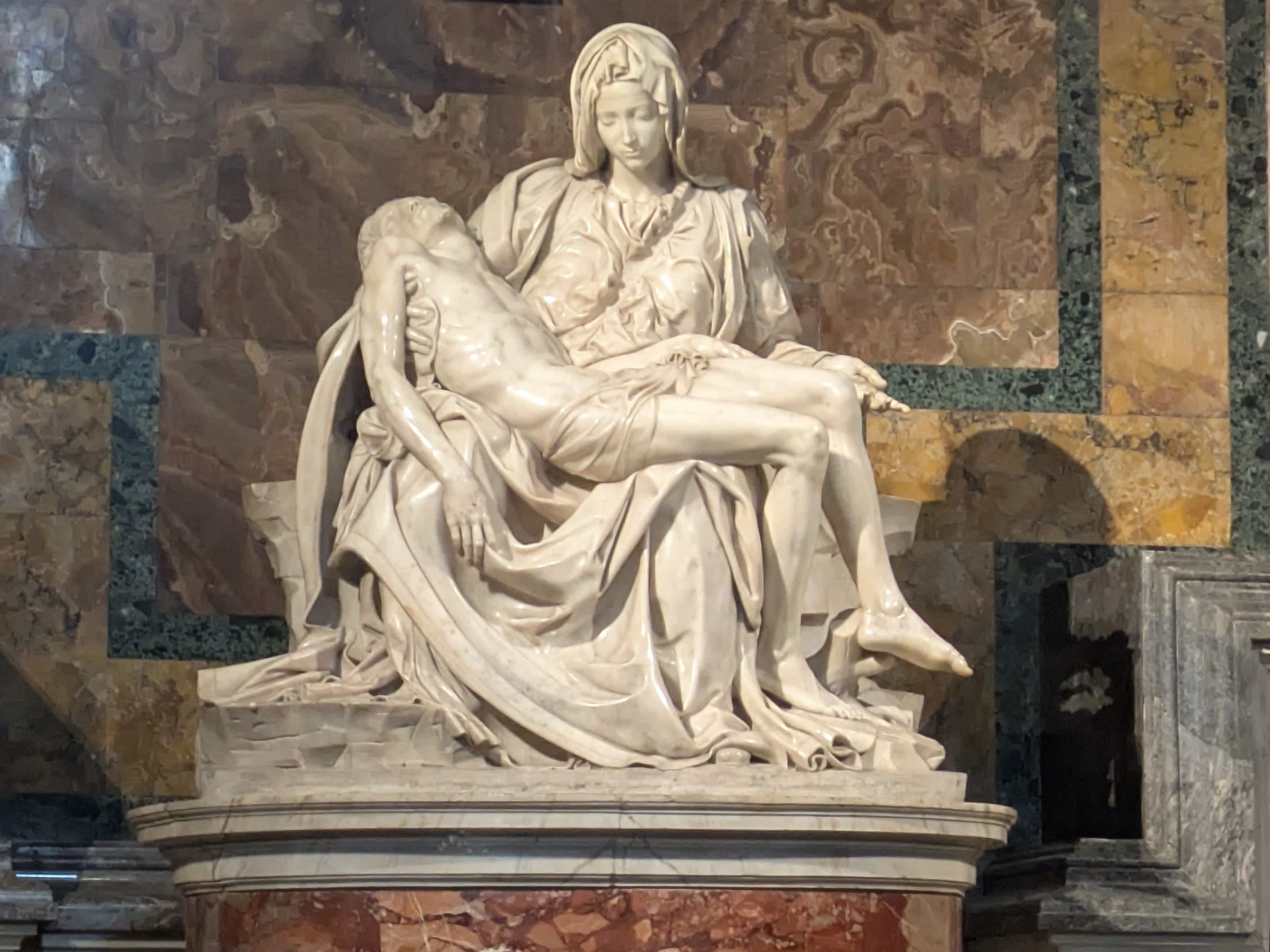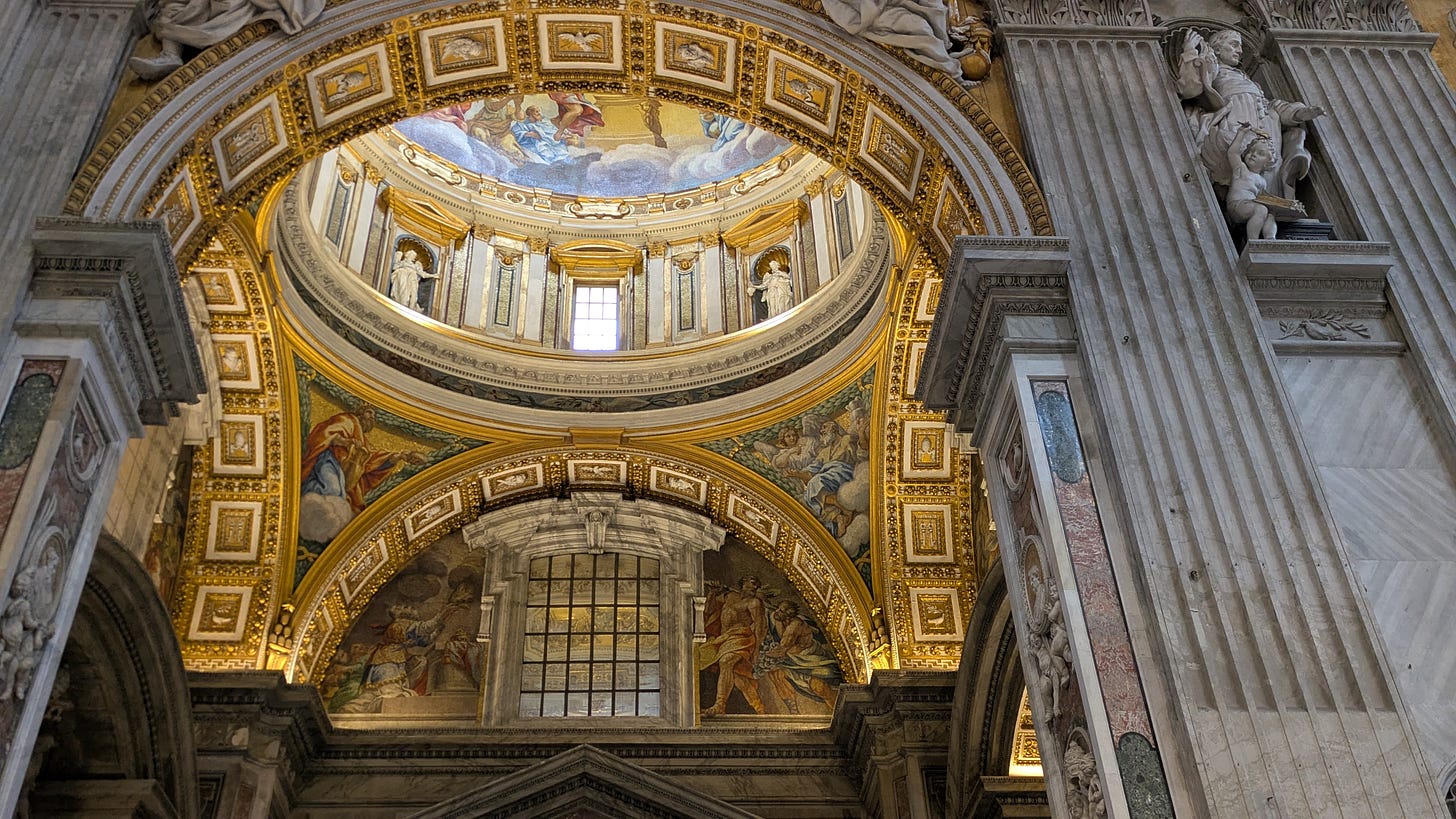 The deacon who spoke to us on the tour was deeply knowledgeable & full of love for Church history. Every two minutes I had to catch my breath over some beautiful or astounding fact or meditation he shared. Throughout the tour, we heard the gentle chanting of choir or the melodic Italian masses being said towards the front of the basilica, enveloping our footsteps in back-to-back services. The deacon pointed at side altars: the mosaic of the Transfiguration, which Raphael considered his best work. The tomb of St. Pope John Paul II. Michelangelo’s Pieta, carrying a lifelike glow impossible to communicate in photos. As we stepped from one side of the basilica to another, we made our reverence to the Blessed Sacrament, kneeling and crossing ourselves atop a circular red tile in the floor. We stood, and the deacon said, “That’s the stone Charlemagne was crowned Holy Roman Emperor on.”