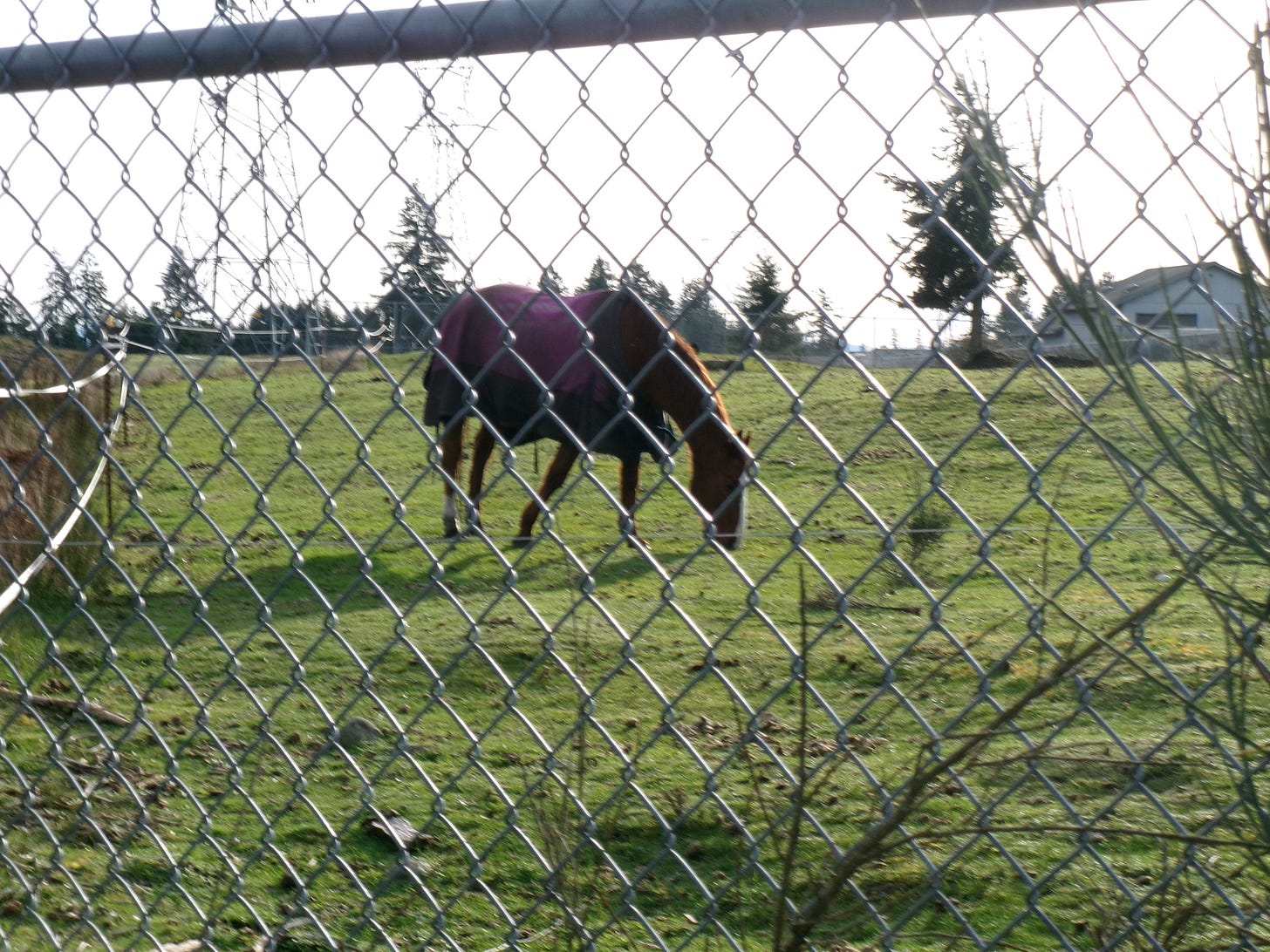 On my walks down the road I used to always stop at a pasture and stroke the retired horse there, Old Gray, until my hands smelled like the thick, earthy musk his mane. A thin line of electrified wire ran around his yard, switching on & off every second, and I would play a dare game there with little brothers or friends. Each of us would grab the wire in turn and see who would have the misfortune of feeling the buzz jolt up their arm and the metallic taste lie on their tongues. I used to secretly savor the feeling and the way it made the top of my spine itch. As I pass the pasture where a new, young, & skittish horse grazes now, I run my finger along the wire. It isn’t on anymore.