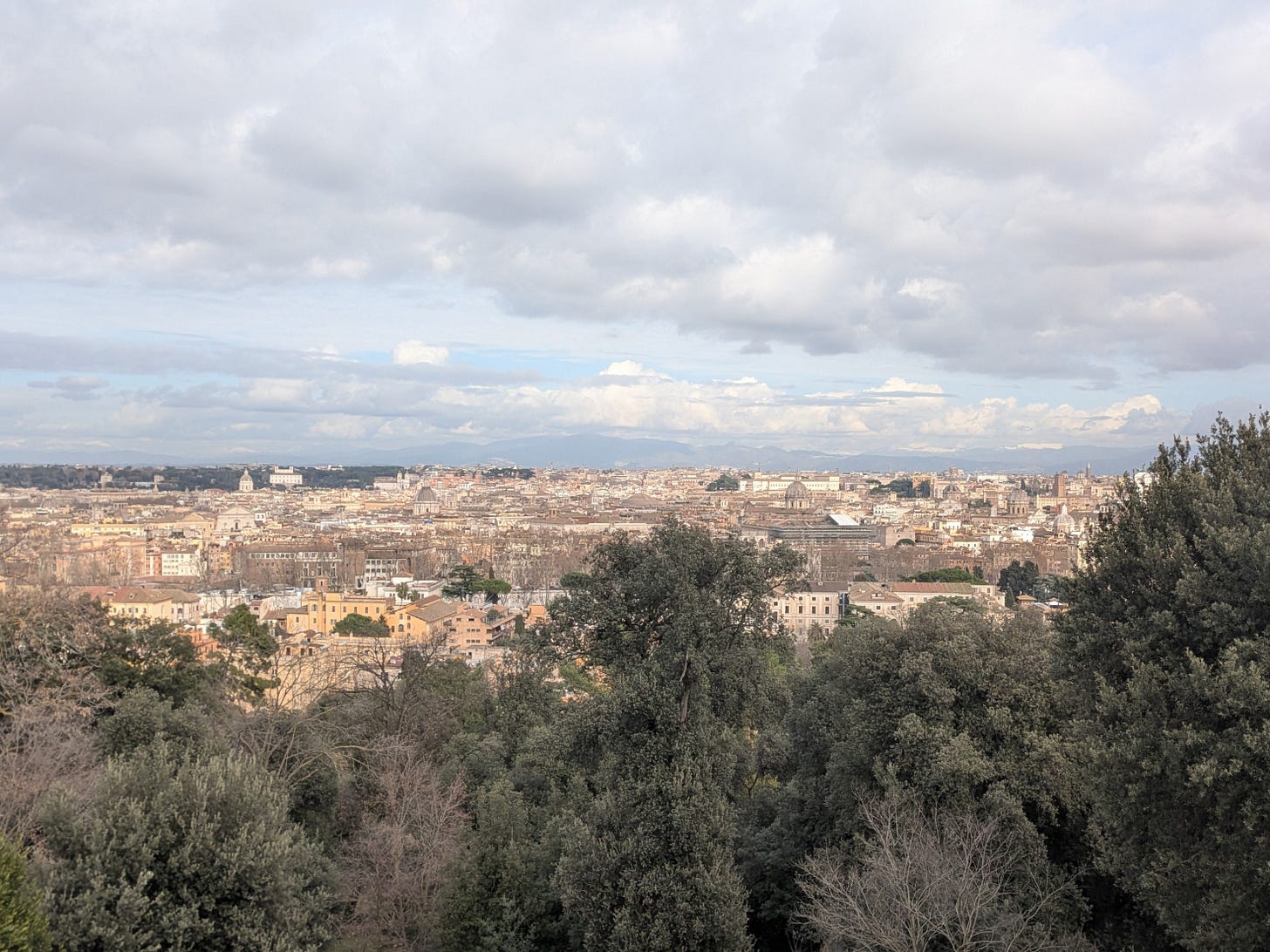 It’s been only a few days. There is time, as our program director said, for Rome to become ours in a much more personal way than it is by simply being our Catholic Inheritance; I’ll know its streets as I’ve already begun to, know its walls and its shops and its people better than I do now. This morning I & a friend took an early walk, twenty minutes to a coffee shop. I ordered a cappuccino & a vanilla croissant in awkward Italian, but the shop owner humored me and made her answers slow so I could better understand them. We ate outside, under a canopy in the whitish morning light mixed with the small pools of warm gold from the hanging bistro lights. We watched people glide past with the easy gait of those used to walking their way through the world, and after an hour went back in for two more cappuccinos. An older Italian woman sat in a purple coat & purple glasses, and I saw her gaze comb over my electric blue coat and my friend’s pink & green shawl as I motioned to her coat and said, “É bello!”